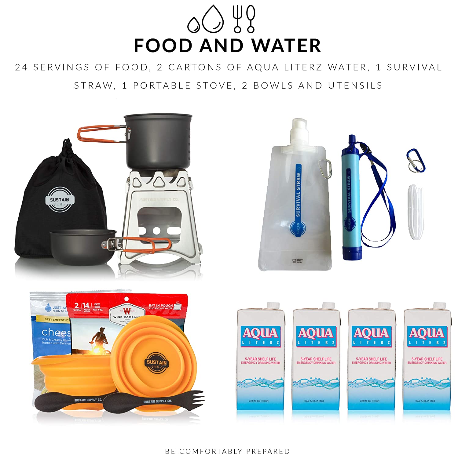 When disasters happen, the first 72 hours afterward are often the most harrowing, stressful and dangerous. You could be dealing with extended power outages, washed out roads – even a lack of running water. Emergency personnel are working tirelessly to help those affected, but reaching everyone takes time. That’s why having a family disaster preparedness kit is essential to making it through the aftermath of a severe event. Sustain Supply Co. ’s Premium Family Emergency Go Bag for 4 people lets you take a set-it-and-forget-it attitude to emergency preparedness. You never need to worry if severe weather threatens because you’ve got it covered – everything your family needs for survival is tucked away all in one convenient backpack. Whether you’re in your home awaiting rescue or have to evacuate suddenly to another location, your kit will help you meet your basic needs. With this emergency survival go bag, you can rest easy knowing your family is well prepared with all the premium supplies needed for an emergency. You’ll save yourself time and money in searching for just the right high-quality items, too – instead just purchasing one ready to go emergency go bag! The emergency survival kit includes all premium supplies, including: 1 large premium backpack, 24 food servings, 4 Aqua Literz waters (33. 8oz refillable cartons), 1 Sawyer Squeeze, 8 Cyalume Snap Lights, 2 LED lanterns, 2 flashlights, 1 fully stocked First Aid Kit, 4 emergency blankets, 2 bath wipes, 1 portable stove, 4 bowls and utensils, 1 MoraKniv knife, 1 Ferrocerium rod, 4 InstaFire tinder, and 4 whistles. After the initial danger has passed, your family could be faced with long-term power outages, food and water shortages, and other challenges. With our premium emergency survival kit, you’ll be ready. In this 4-person survival kit you’ll find 135 ounces of water for drinking and cooking, as well as bath wipes, which allow you to avoid wasting drinking water for washing. A Sawyer Squeeze water filtration system lets you obtain additional water from nearby sources, such as streams or lakes, rendering it safe for consumption. The portable stove makes heating food and water possible during emergency situations. A hot meal can go a long way toward providing comfort and a sense of normalcy for your family in times of severe stress, and 24 Food Servings (enough to sustain 4 adults for 72 hours), as well as 4 bowls and utensils, are included in the family emergency survival bag for use after you’ve exhausted the existing groceries in your home. You’ll also find two options for starting fires as needed: a Ferrocerium rod that requires no fuel and 4 InstaFire tinder which can be used as tinder when no other sources are available. The emergency preparedness kit even contains 3 different types of light sources. Two LED lanterns offers ambient light for a room at night; 8 Snap Lights give you general illumination with no batteries or open flames and work especially well if you need to signal for help; and two battery-powered flashlights provide a powerful directional light source for specific night-time needs but should be used sparingly to prolong battery life. Basic first aid supplies are included in this disaster preparedness kit as well as 4 emergency blankets that keep body heat in to optimize warmth and dryness. The kit itself is contained in a premium grab-and-go backpack in case of a need for sudden evacuation. With its multiple interior pockets, you can organize the backpack in the best way for your family, and even customize it by including copies of important documents, cash, prescription medications (be sure to keep these up-to-date), batteries and even toys for your kids. Every item included in our premium emergency survival kit are superior quality. After a devastating disaster, your family is already sacrificing so much – don’t settle for subpar emergency supplies. With Sustain Supply Co. , you can be sure you’re equipped with the most durable and effective tools and the best freeze-dried food and hydration options out there. We’re committed to keeping your family safe and healthy in the aftermath of a tornado, hurricane, earthquake or other major disastrous event.